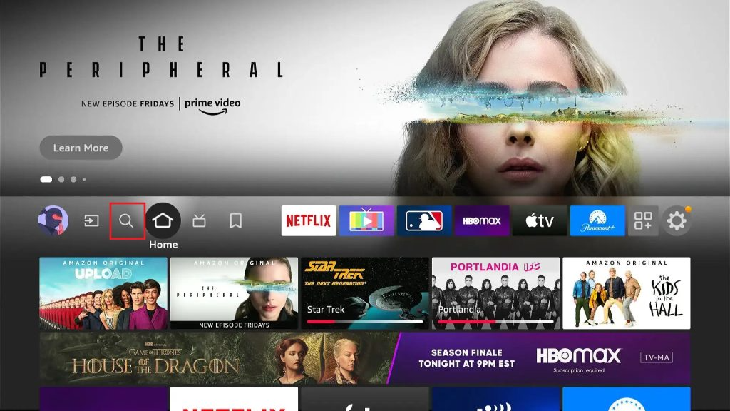 Une application de chargement latéral est nécessaire pour installer ce lecteur IPTV sur votre appareil Firestick. Installez donc Downloader et procédez à l’installation de l’application en utilisant la méthode suivante. [1] Allumez votre appareil Firestick avec une connexion Internet et sélectionnez l’ icône de recherche sur la page d’accueil .